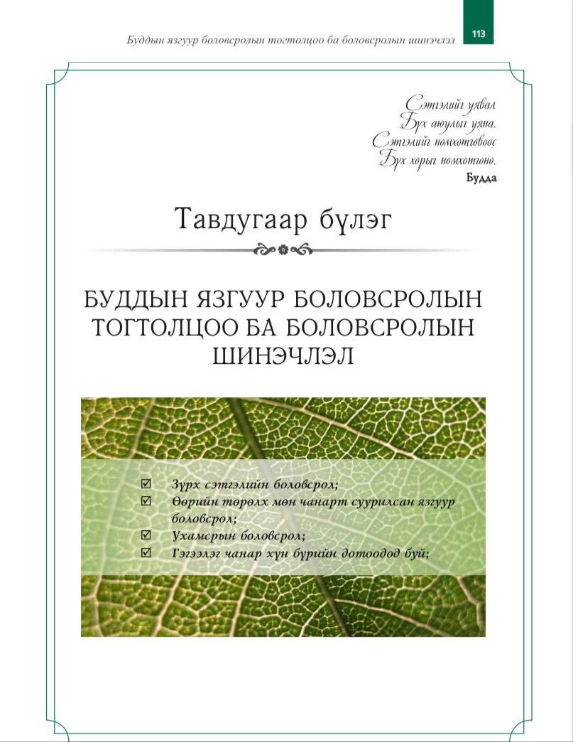 ТАВДУГААР БҮЛЭГ. БУДДЫН ЯЗГУУР БОЛОВСРОЛЫН ТОГТОЛЦОО БА БОЛОВСРОЛЫН ШИНЭЧЛЭЛ